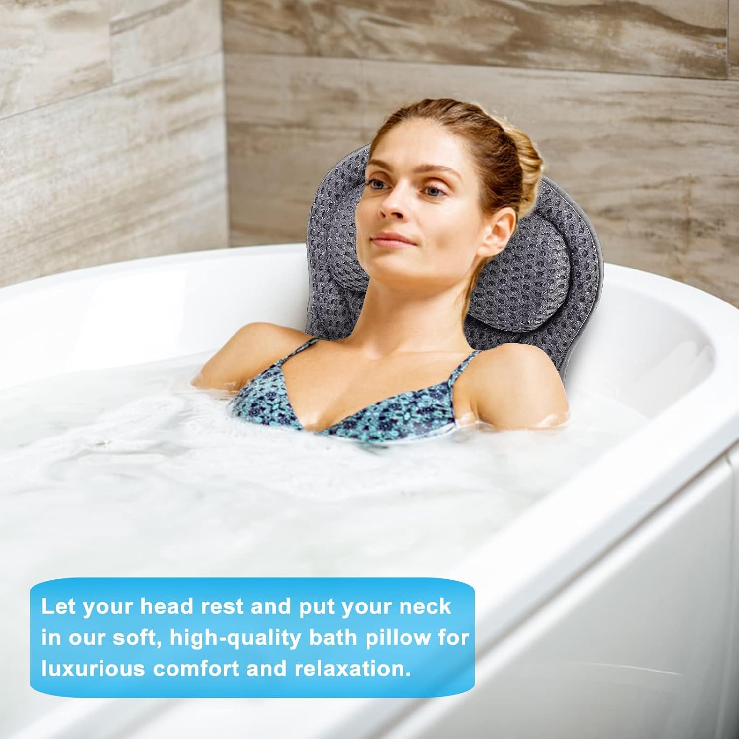- Let your head rest and put your neck in our soft, high-quality bath pillow for luxurious comfort and relaxation. Our generous ergonomic design fits seamlessly and supports the head, neck, and shoulders to relax the tense and tired muscles after a long day. Perfect for bathtubs, and spas and a great gift for women and men.