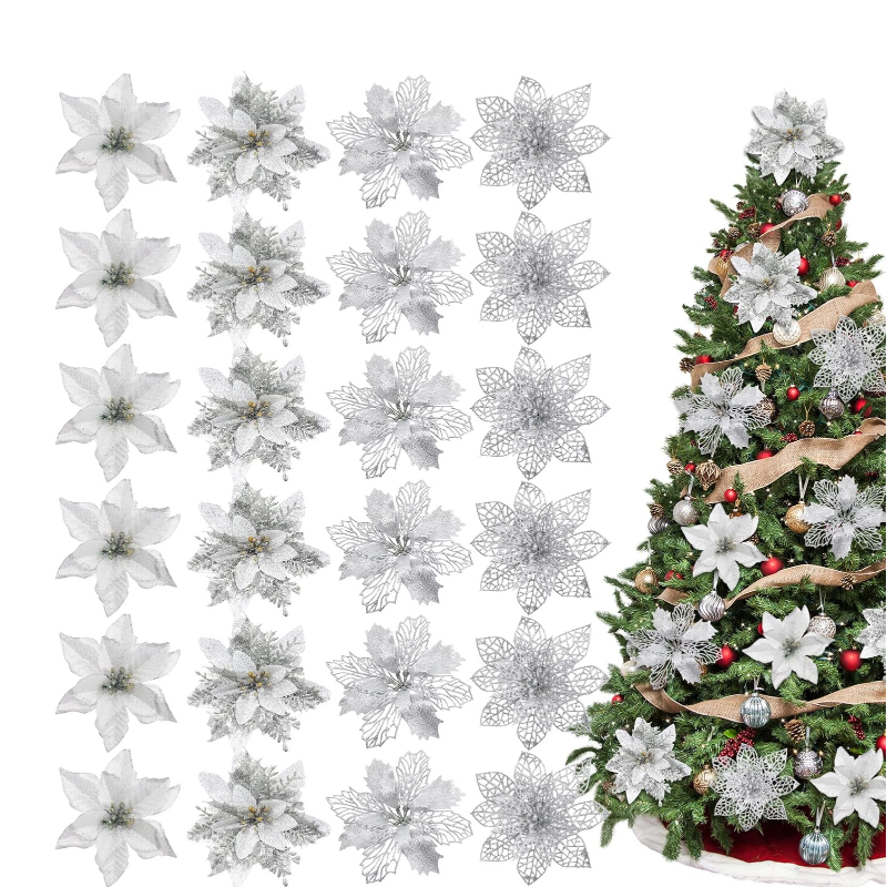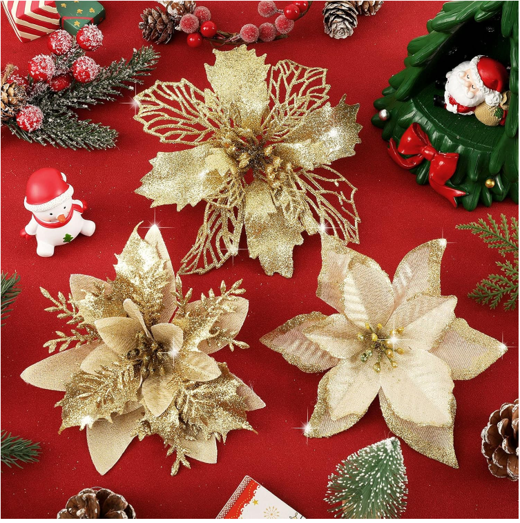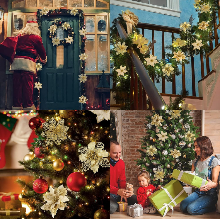 Good Material :These Christmas flowers are made of durable plastic, good fabric and glitter powder, safe, reusable and the color will not easy to fade.