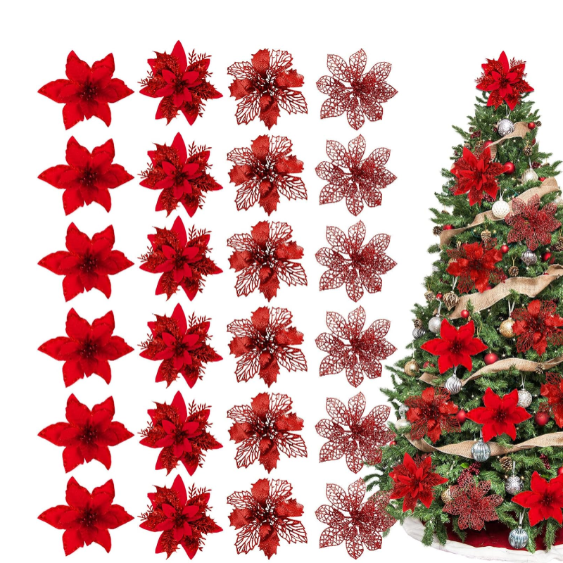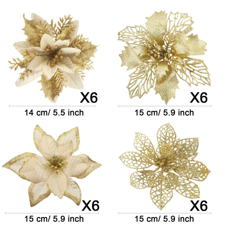 4 Styles - 4 different designs of Christmas poinsettia, each design has 6pcs, exquisite looking and good craftsmanship make them great decoration for your home and party, and bringing more festive feeling to your home.