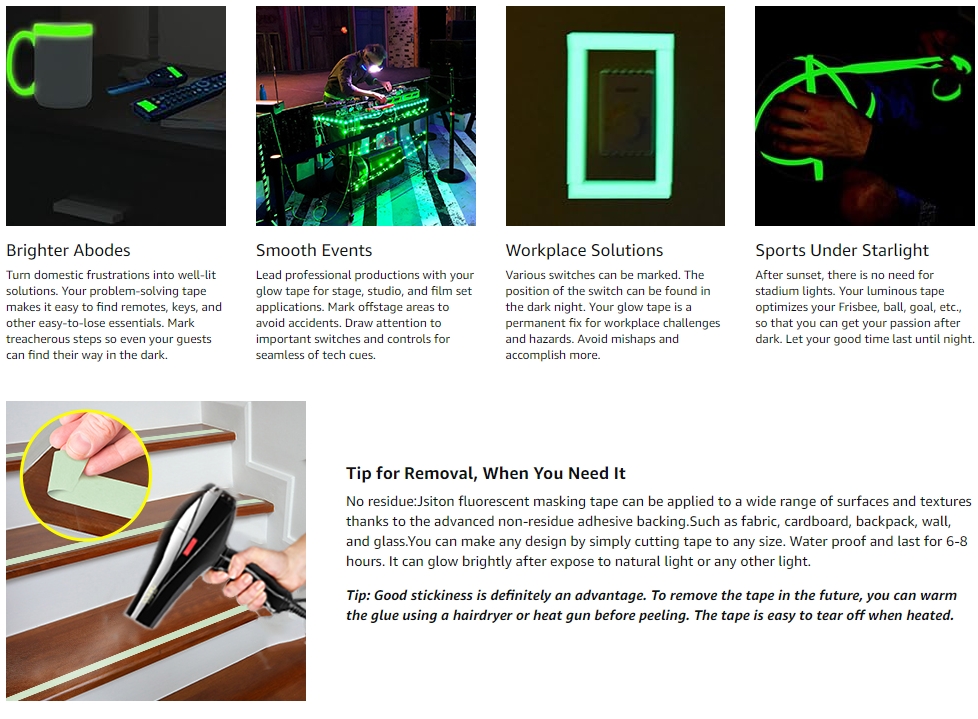 - QUICK & EASY USE – Jsiton fluorescent masking tape can be applied to a wide range of surfaces and textures thanks to the advanced non-residue adhesive backing.Tip: Good stickiness is definitely an advantage. If you need to tear off the tape. You can use a hairdryer to blow hot air. The tape is easy to tear off when heated