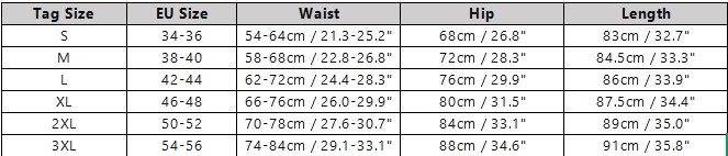 | Tag Size | EU Size | Waist | Hip | Length | Weight |