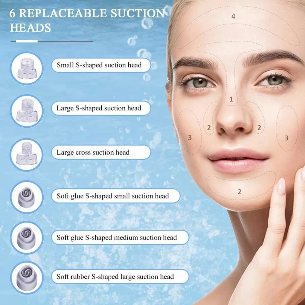 Mixed bubble water: When sucking, you can add non-viscous nutrients to clean and replenish water to moisturize your skin. Blue light can provide an effective cleaning effect, thereby improving hygiene and avoiding irritation or damage to the skinMultifunctional use: The 3 suction cups can be adjusted freely to widely adapt to different types of skin, such as dry skin, oily skin and normal skin, and equipped with 6 interchangeable suction tips, which can be used in different regions of skins, full