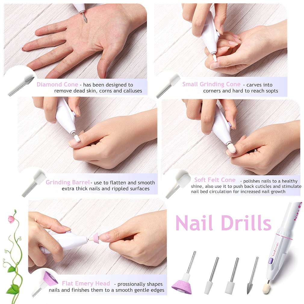 - 5 interchangeable attachments: This nail drill comes with 5 interchangeable attachments, including a grinding bit, a polishing bit, a sanding bit, and two filing bits.