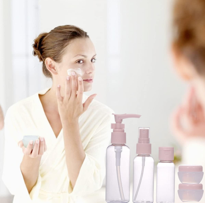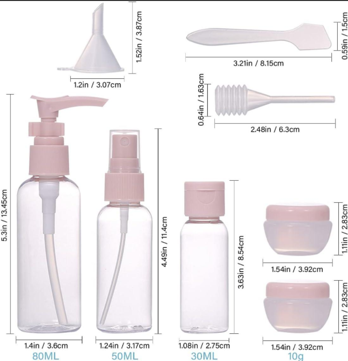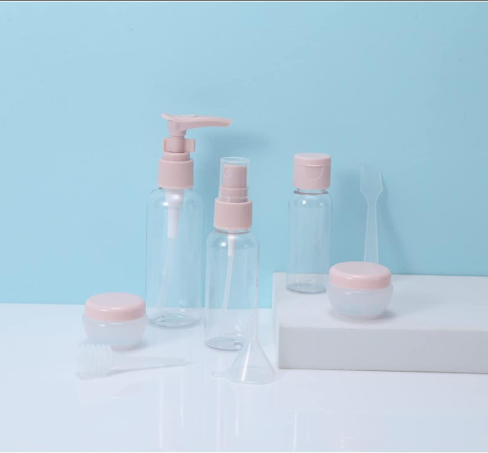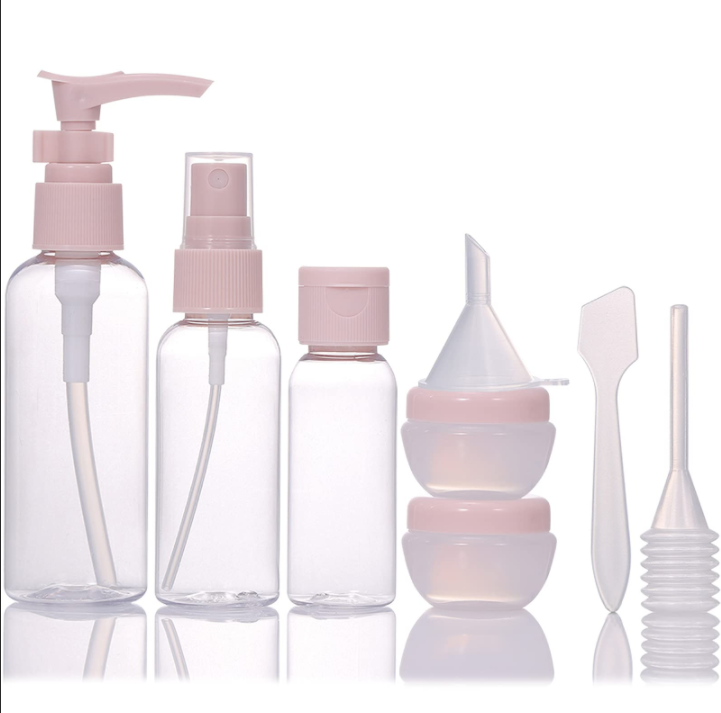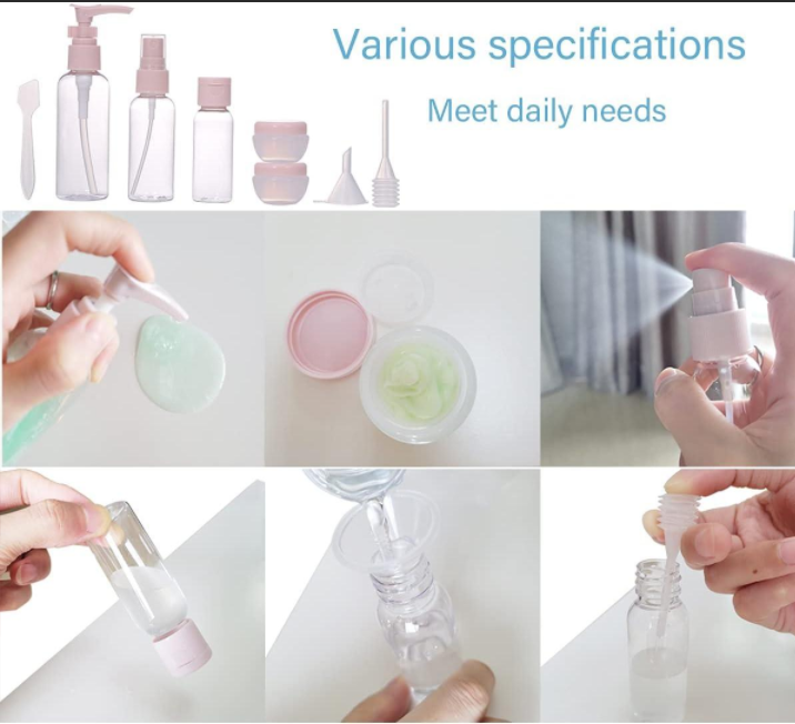 8PCs travel bottle set can be the needs of travel with cosmetics and toilet articles, portable size, the largest bottles are 80ml, these toilet articles set is permitted in hand luggage. With a zipper, waterproof bag, ideal for travel, swimming, travel, camping and business trip, etc. Safe material, BPA free, durable and reusable