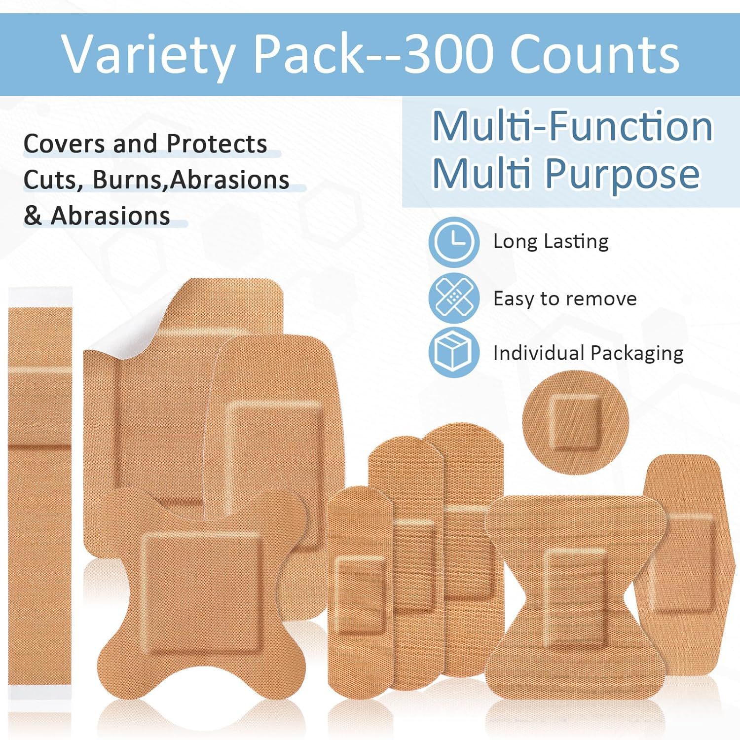 Package Includes: 300 pieces of bandages of diverse sizes and types; Comprehensive Assortment: this multipack offers 10 different sizes and shapes of flexible bandages; These bandages can be applied for first-aid of minor cuts, scrapes, and burns at home; Suitable for the needs of both households and small businesses
