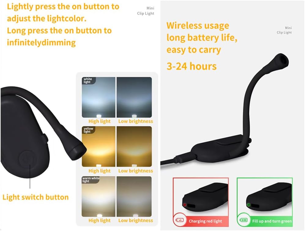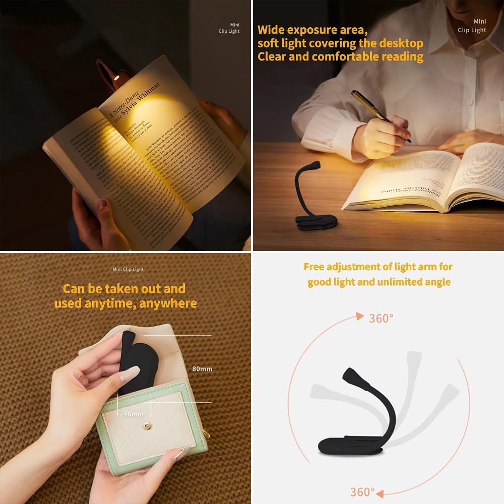 - Mini reading lamp: It is very flexible and portable, The hose also adjusts the lighting angle, can be placed anywhere you want to use it.