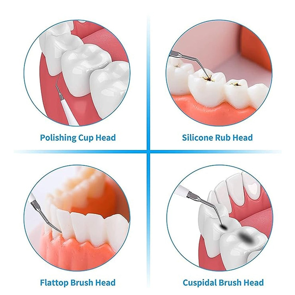 - 2 medical-grade alloy steel heads (frosting and flat) for targeted tartar and stain removal