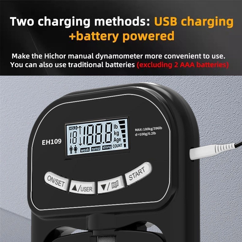 - [Bright Screen Display & USB Charging] The newly upgraded bright screen function of grip strength tester allows you to clearly see the readings of strength tester in a dark environment. It can be recharged with a USB cable, which is more environmentally friendly. Traditional 2xAAA batteries (Not included) can also be used.