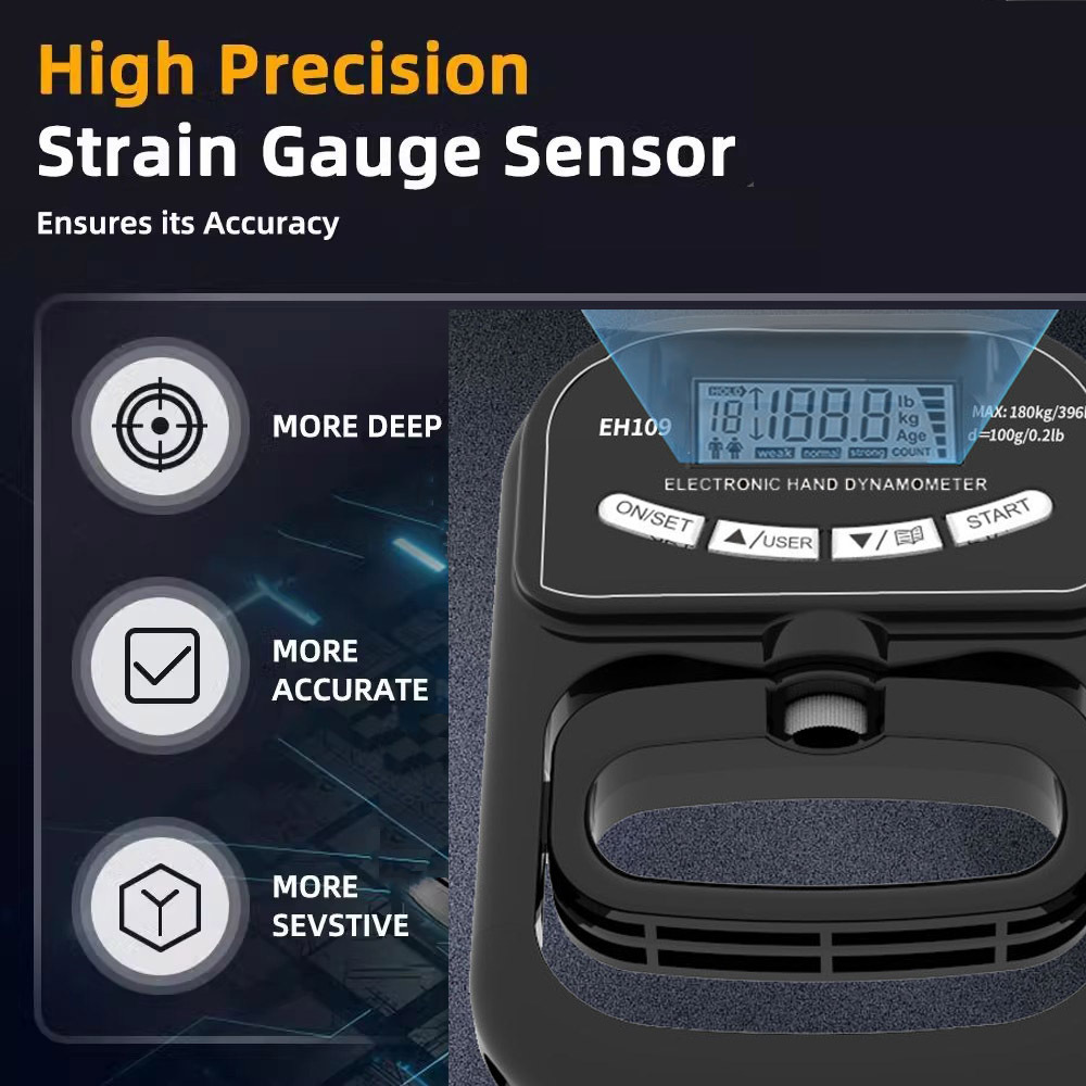 - [High Accuracy] This grip strength tester is equipped with a high- strain gauge sensor, which can accurately measure grip strength up to 396 pounds.